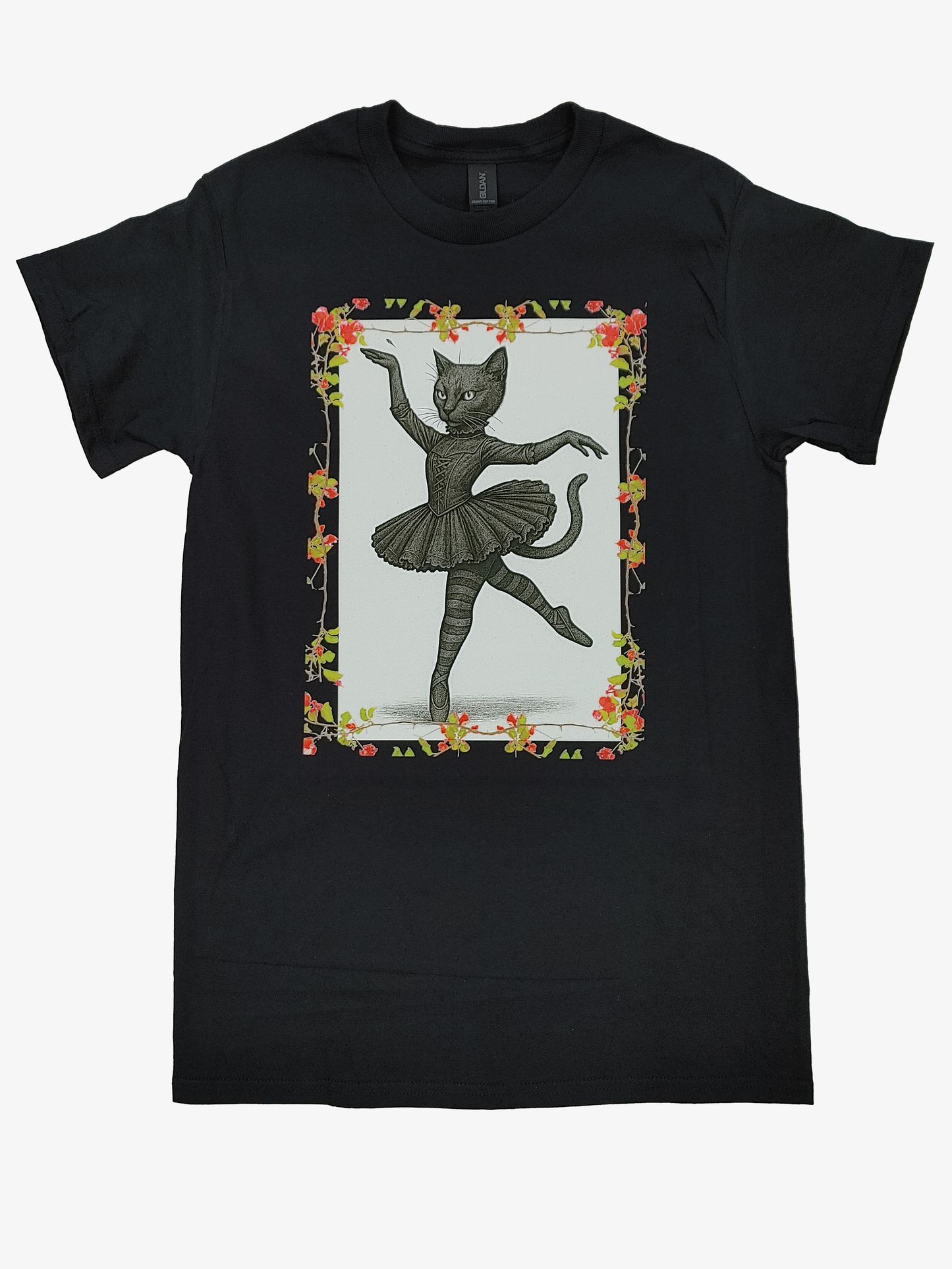Black t-shirt with a graphic of a cat in a ballet pose surrounded by flowers on a white background